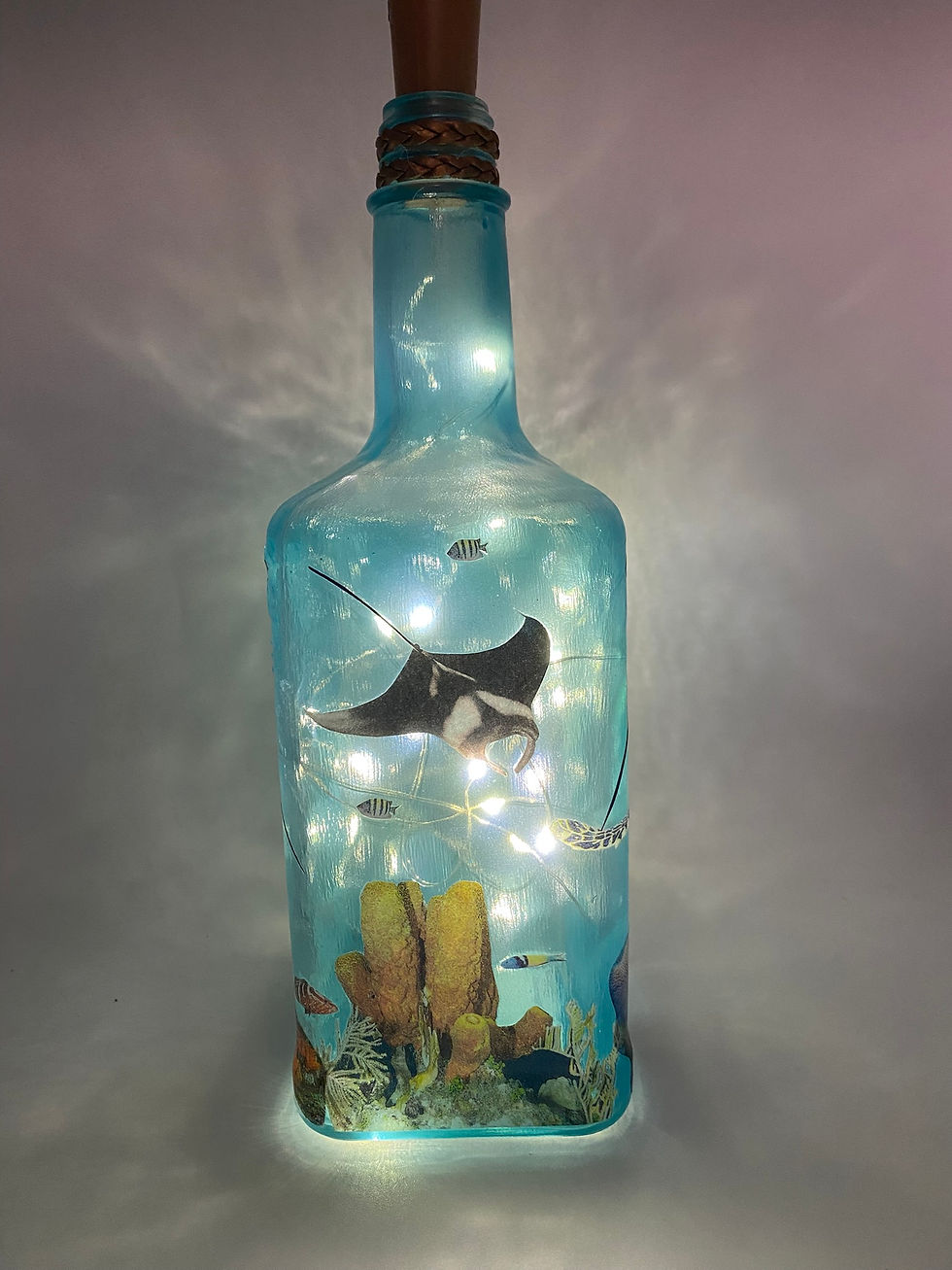 Unique bottle lights, decorated with stunning underwater photos from the Cayman Islands.